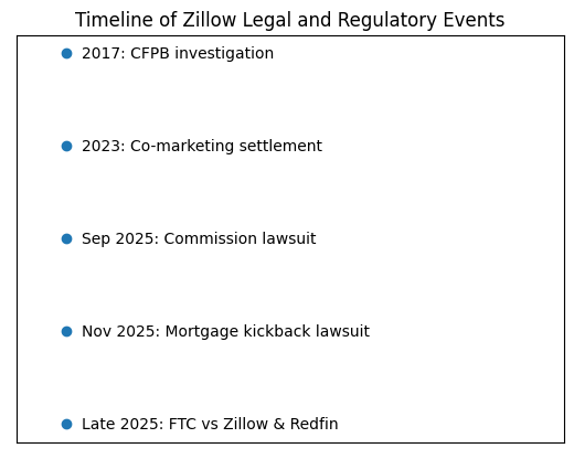 The controversies build on years of scrutiny. In 2017 the CFPB investigated Zillow’s earlier co‑marketing program for potential RESPA violations. In 2023 Zillow settled a class‑action tied to that probe. Then, within a few months in 2025, the three big cases above landed in court. The chart below summarizes the key events.